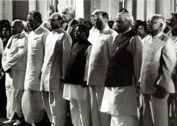 L-R – PV Narsimha Rao, Chandra Shekhar, V.P. Singh, P. A Sangma, Justice A. M.